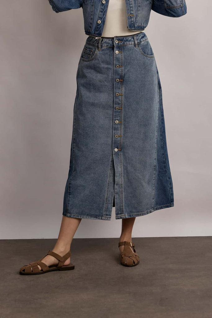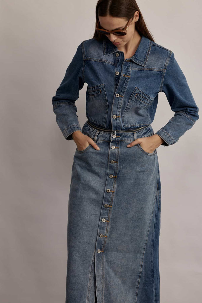 A fashion-icon denim skirt with a zipper that connects to the matching denim top – wear it as a full dress or as a stand-alone piece. Featuring full-length buttons and pockets, this flattering A-line cut combines style and comfort. A casual-chic look perfect for any season, and easy to pair with any top.