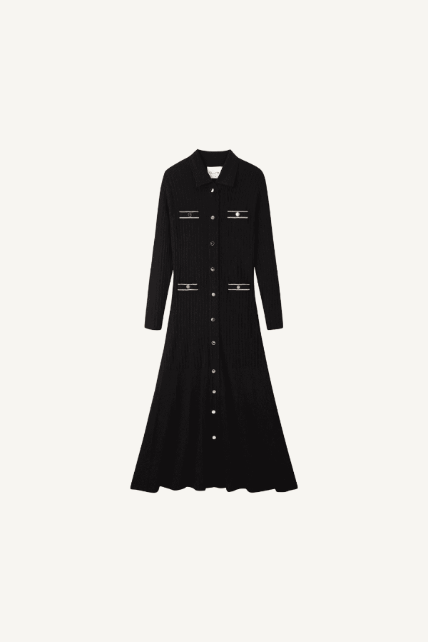 A flattering knit dress with gold buttons and a collar. It gently hugs the waist and flows down for an elegant, feminine look. The soft, stretchy fabric moves comfortably with you, making it perfect for everyday wear or a casual evening out. Sandra Inspired