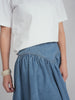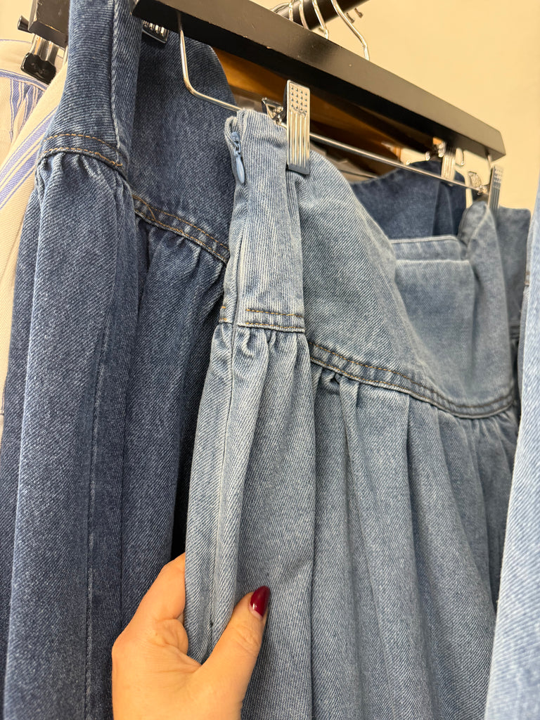 A maxi denim skirt with a yoke, front triangle detail, and gathering . A unique and flattering design, perfect for a casual look with a stylish touch.