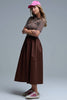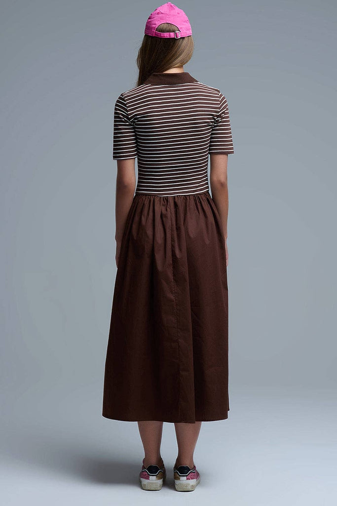 Discover the perfect blend of elegance and casual sophistication with this beautiful dress. It features a classic polo-striped top that adds a timeless touch complemented by a flowing poplin midi skirt in a rich chocolate brown. The design includes convenient side pockets for functional style while the fashionable 3/4 sleeves provide a flattering silhouette making it an ideal choice for both daytime and evening events. Whether you're heading to brunch or an outdoor gathering this dress will keep you looking effortlessly chic.