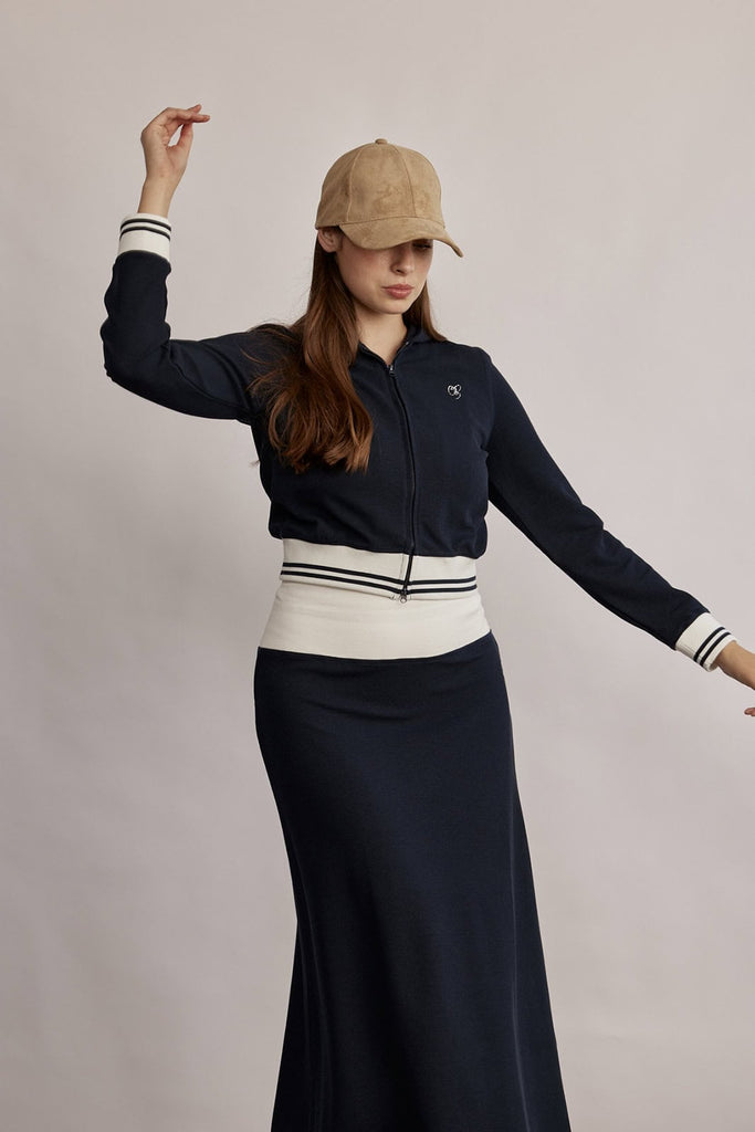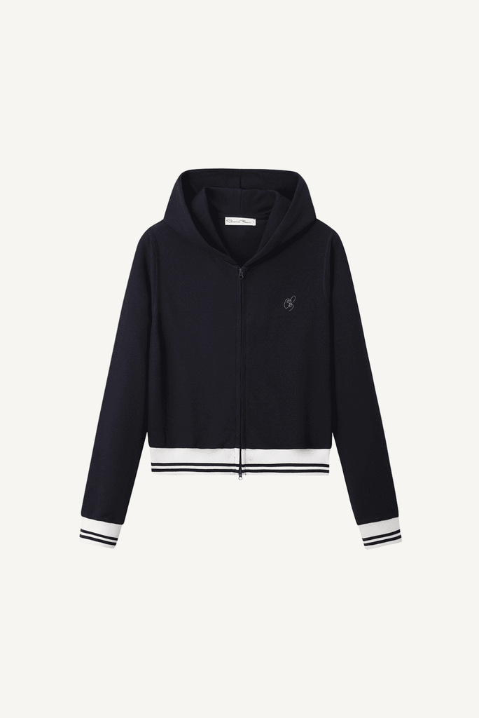 Varsity ribbed hoodie set with logo. Thin, casual but elevated.