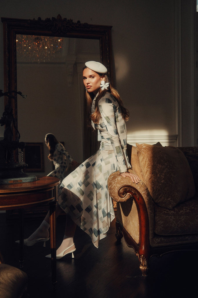 Modern and distinctive, this stretch mesh dress is designed with unexpected details that create a striking silhouette. With sculpting ruching, a drop waist, and a fluid handkerchief hem, it’s a fresh take on an elevated occasion piece.