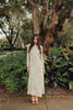 Crafted from lightweight printed linen, the Valencia dress balances structure and ease with a quietly refined sensibility. The bodice is softly fitted through the waist, creating definition before releasing into a fluid, straight skirt that moves effortlessly with the body. A clean neckline and minimal seaming keep the focus on the natural texture of the linen and the subtle prin