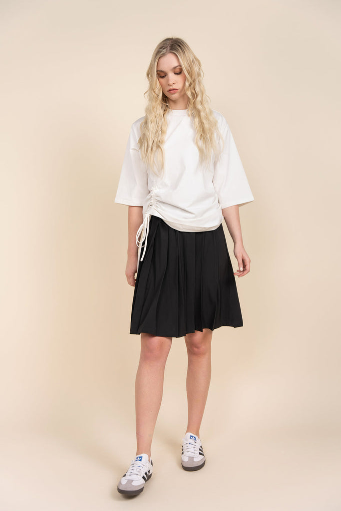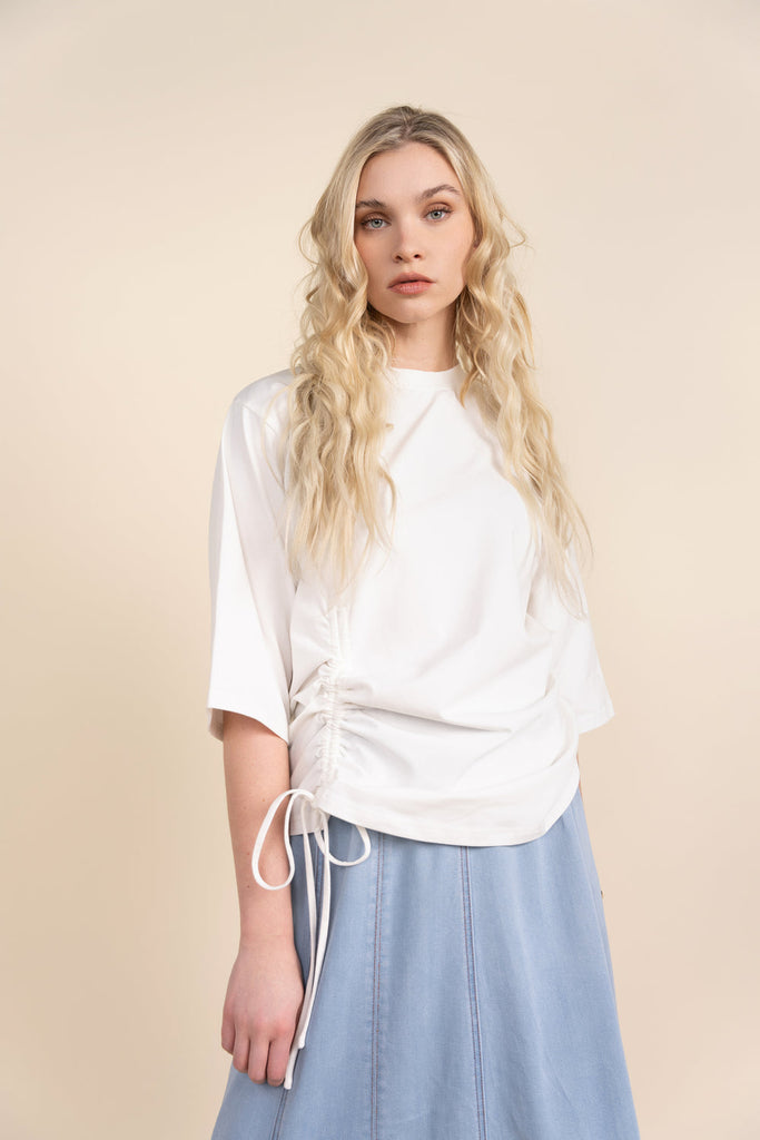 The Damen Top offers a sophisticated option for everyday wear. Made with soft, comfortable fabric, this boxy tee features a wide 3/4 sleeve for a stylish touch. The drawstring tie on the side allows for customizable fit and adds to the overall aesthetic. Upgrade your wardrobe with this versatile and chic top.
