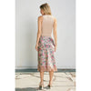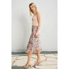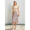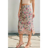 Floral satin midi skirt. Model is 5'9" and wearing size Small. - Pull on - A-Line silhouette - Lace hem - Elastic waistband - Side slit - Lined Shell: 100% Polyester Lining: 100% Polyester