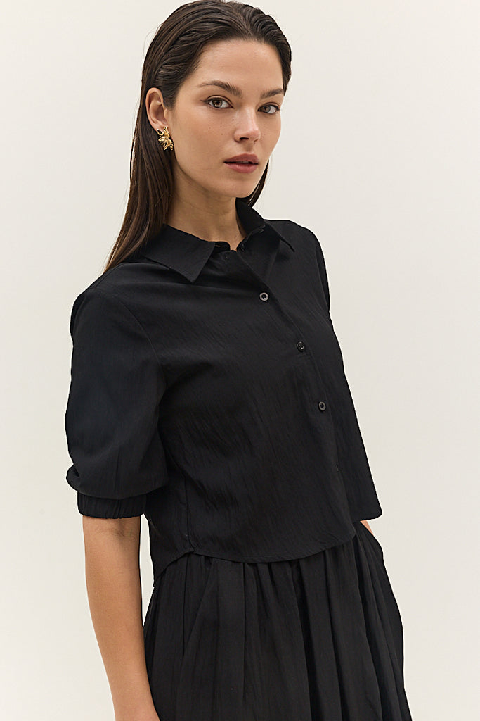 Thin cropped button down shirt. High low effect. Longer in the back, shorter in the front. Pair it with your its matching skirt.