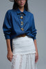 Introducing our relaxed denim shirt expertly crafted for both comfort and style. This versatile shirt features long sleeves and a classic polo collar perfect for casual outings. The standout design includes three unique gold abstract buttons that catch the light along with a convenient pressure button inside. The button placket is completed with matching regular buttons creating a cohesive look. This isn’t just a wardrobe staple it’s a statement piece that pairs beautifully with jeans or can be layered over a dress making it a must-have for your collection.