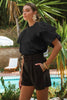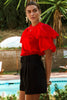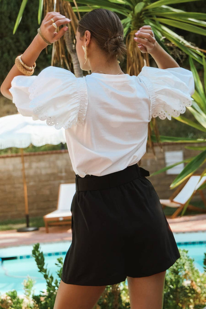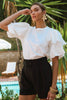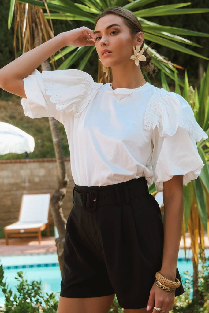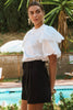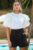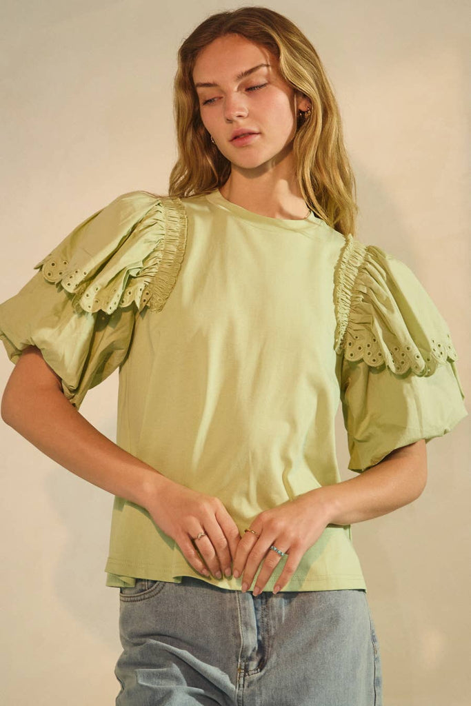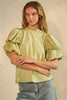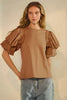 Crew neck jersey t-shirt with contrast poplin bubble sleeve.