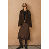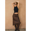 Satin midi skirt. Model in DARK CHOCOLATE is 5'6", wearing size Small. - Pull on - A-Line silhouette - Lace hem- Elastic waistband- Side slit - Lined Shell: 100% Polyester Lining: 95% Polyseter, 5% Spandex