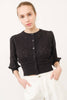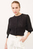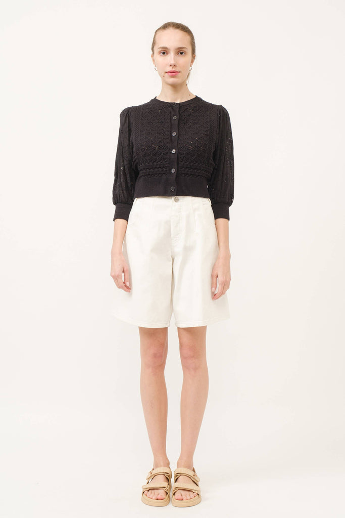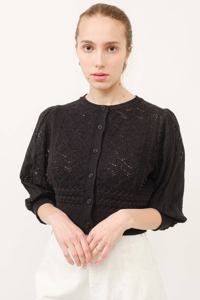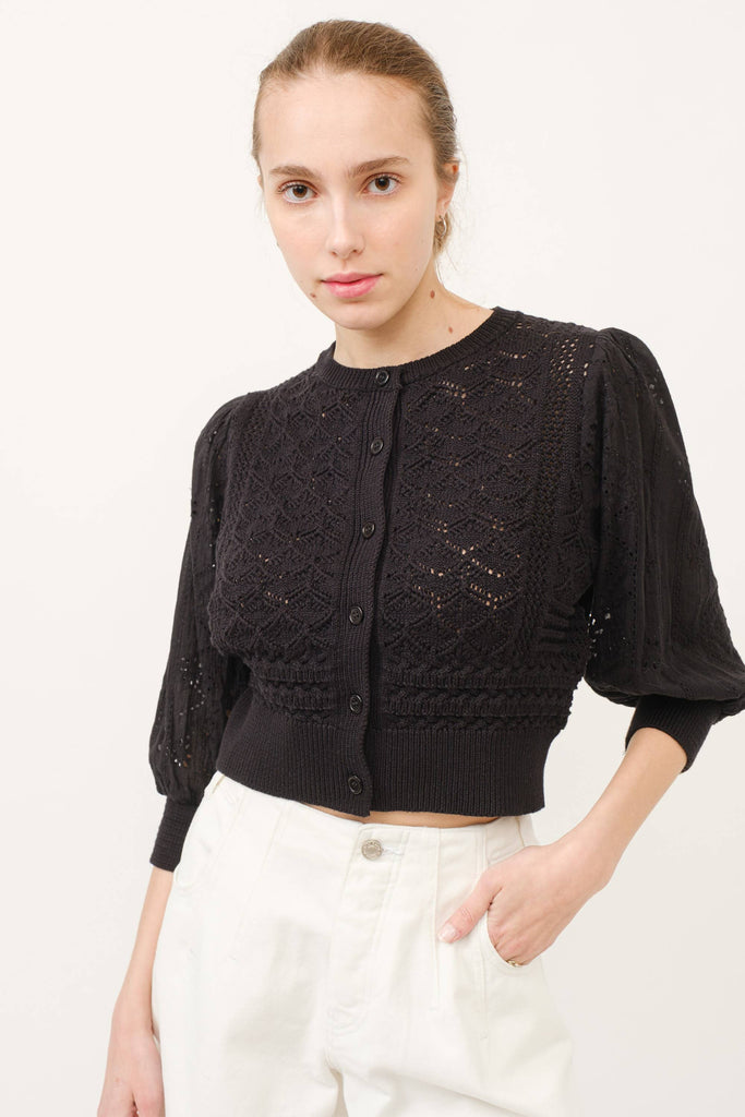 Classy and dainty, the embroidery on the woven sleeves and the assortment of stitching throughout this open sweater ensures an elegant vibe. The Hendry cardigan consists of a round neck, 3/4 sleeves, sweater ribbed cuffs, and a button down enclosure.