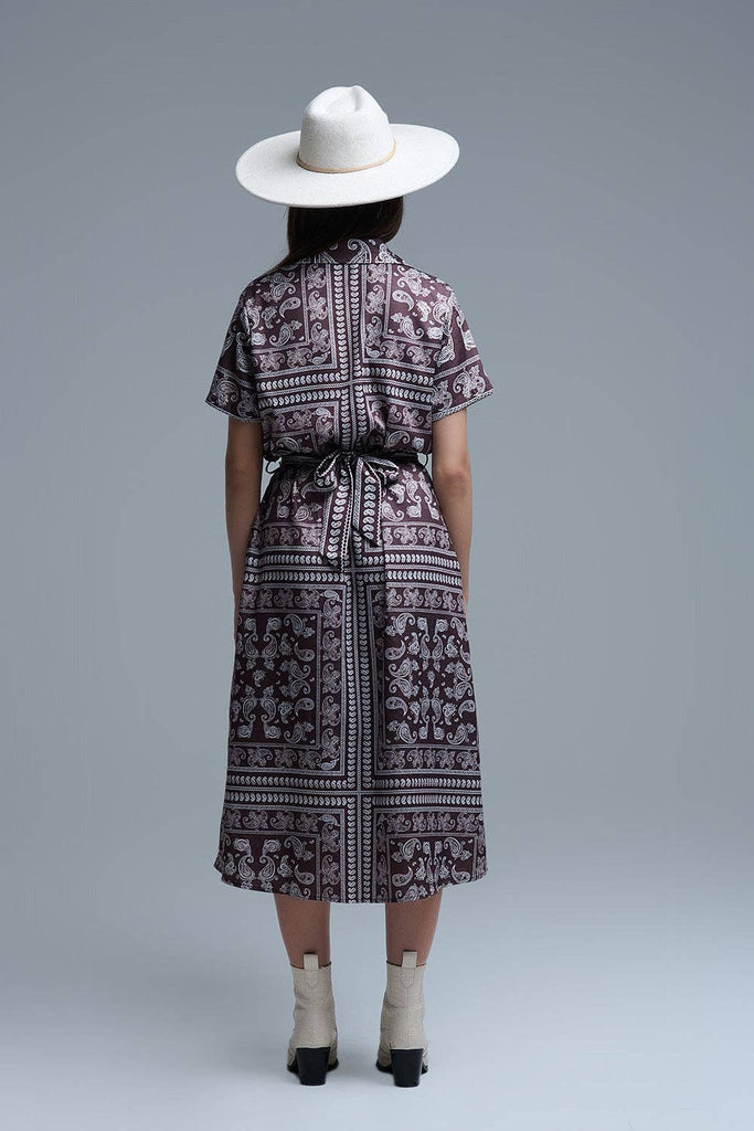 Discover the elegant Short Sleeve Paisley Print Shirt Dress in a warm brown hue perfect for any occasion. This dress showcases a stylish short sleeve polo collar adding a touch of sophistication to a classic design. The button placket down the front allows for easy wear and a customized fit while the side pockets provide practical storage for small essentials. Complementing the dress is a fabric belt in the same beautiful paisley pattern accentuating your waist and enhancing your silhouette. Ideal for casual outings or dressier events this versatile dress effortlessly combines comfort and style making it a must-have addition to your wardrobe.