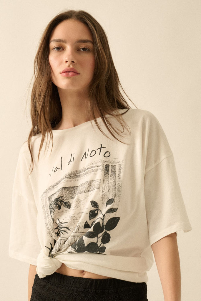 Vintage-style window outlooking the region of Noto, Sicily graphic print with text that reads: "Val di Noto Sicily".