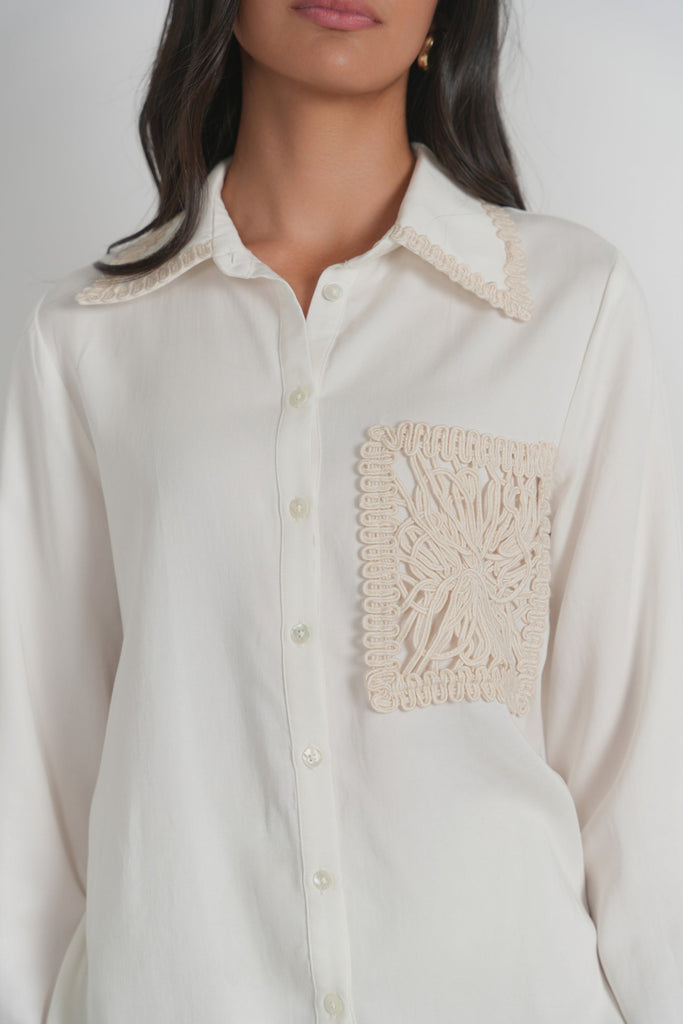 The Vienna top is cut from an airy, fluid fabric that drapes effortlessly on the body. Designed with a relaxed silhouette and classic collar, it's finished with a subtle crochet pocket detail that adds texture without disrupting the clean lines. The feel is soft and breathable, making it an easy layering piece or a stand-alone staple in warm weather. Polished yet undone, it's a quiet statement piece with thoughtful detail.